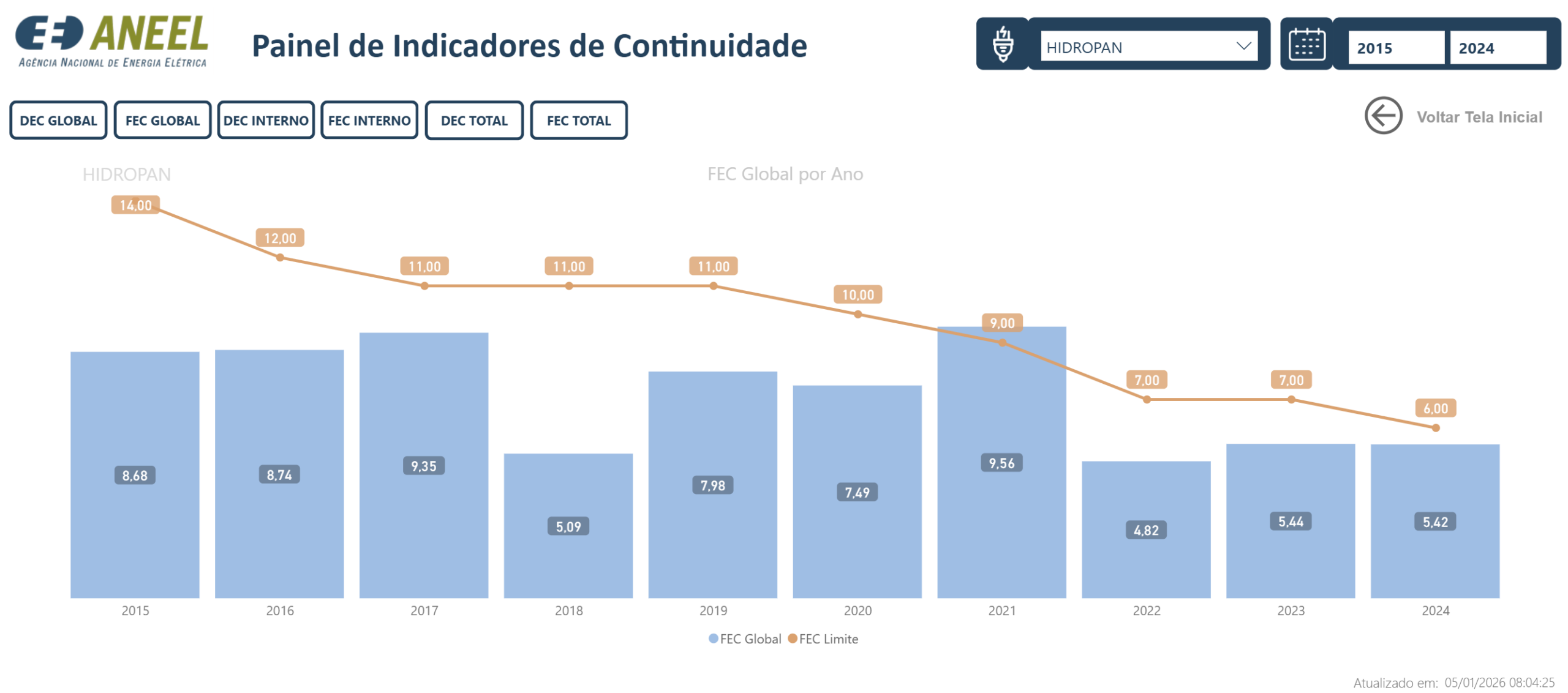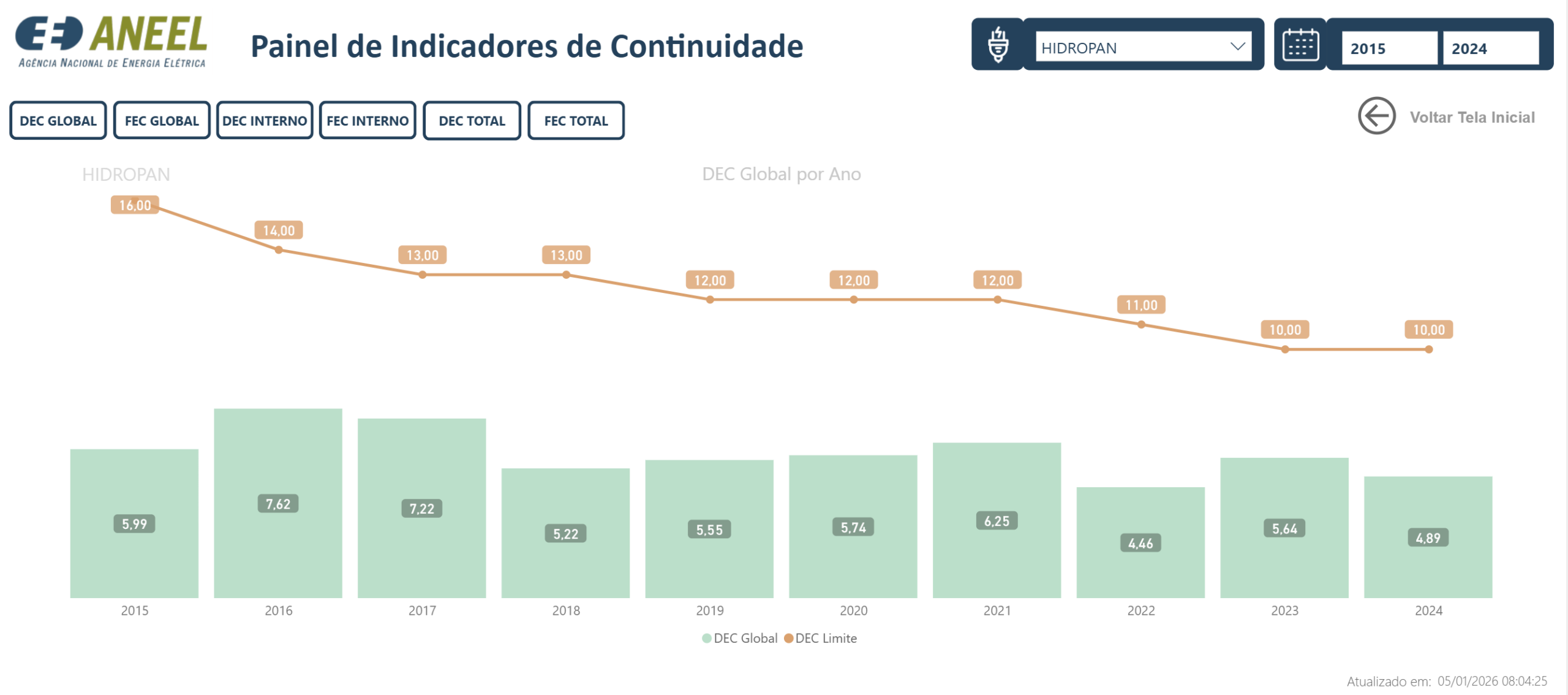Na HIDROPAN, nosso compromisso é manter a energia ligada com o máximo de eficiência e segurança. Para monitorar a qualidade do nosso serviço e garantir a transparência com nossos consumidores, disponibilizamos abaixo o histórico dos indicadores DEC e FEC.